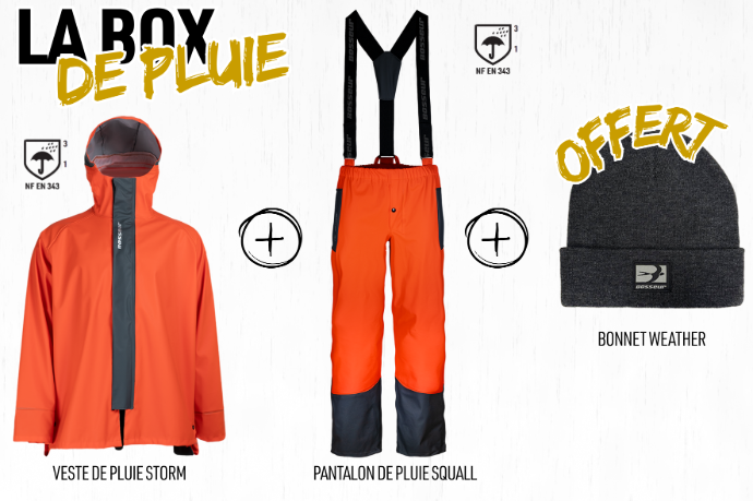 1 veste de pluie Storm + 1 pantalon de pluie Storm = 1 bonnet Weather OFFERT